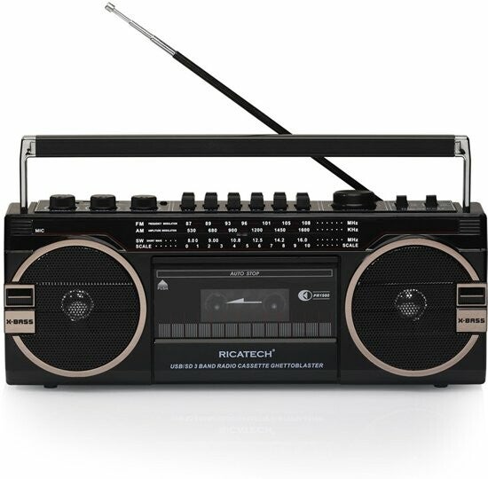 Weet je het nog? Paraderen over straat in de jaren 80 met je eigen ghettoblaster. Met een groep vrienden samenkomen rondom die draagbare radio om je favoriete muziek te beluisteren vanaf een casettebandje? Deze tijd is nu helemaal terug dankzij de Ricatech PR1980 Old School Ghettoblaster. Met alle features van toen, maar natuurlijk ook met de techniek van nu. Luister via de 3 bandsradio naar AM-, FM-, of SW- Radio of herbeleef de jaren 80 compleet door gebruik te maken van de ingebouwde casettespeler. De PR1980 kan alleen nog veel meer. Via de USB en SD Poorten kun je ook luisteren naar je modern vastgelegde muziek. En je kunt jezelf als vanouds opnemen met de ingebouwde microfoon en opneemfunctie. Zo neem je jezelf direct op op een casettebandje. Meer jaren 80 wordt het niet! Ook beschikt de PR1980 over een hoofdtelefoonuitgang, 8 watts xBass speaker, 2-bands equalizer en een draaghendel, zodat je hem overal en altijd mee naar to kan nemen. En de energie? Die kan uit het stopcontact komen, maar ook uit old-school batterijen! De ghettoblaster is weer helemaal terug!